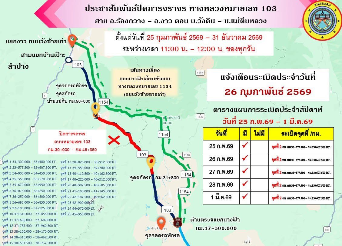 📢 สภ.งาว ประชาสัมพันธ์แจ้งเตือนปิดการจราจร ทางหลวงหมายเลข 103 ขอความร่วมมือประชาชนผู้ใช้รถใช้ถนน โปร